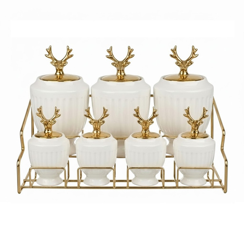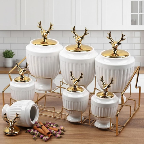 ظروف روی استند فلزی آبکاریشده قرار میگیرند که علاوه بر استحکام، باعث نظمدهی بهتر و دسترسی آسان به مواد میشود. این مجموعه برای نگهداری چای، شکر، قهوه، ادویهجات و خشکبار مناسب بوده و انتخابی ایدهآل برای آشپزخانههای مدرن و کلاسیک، جهیزیه و هدیه است.